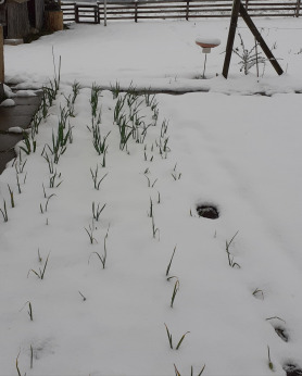 2.4.22: Unter der Schneedecke haben die Erbsen, Kefen, Rüebli Radiesli und Zwiebeln in den Tagen bevor, den Weg in das Gartenbeet gefunden....